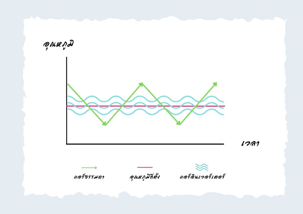 ยกตัวอย่างหากทำการตั้งอุณหภูมิไว้ที่ 25 องศา ระบบจะเร่งทำความเย็นให้ได้ประมาน 24 องศา แล้วทำการชะลอตัวเอง รอให้อุณหภูมิห้องสูงขึ้น เมื่ออุณหภูมิเเตะที่ประมาน 26 องศา ระบบจะทำการเร่งคอมเพรสเซอร์ทันที เพื่อคงอุณหภูมิให้ลงมาอยู่ที่ 24 องศาเช่นเดิม